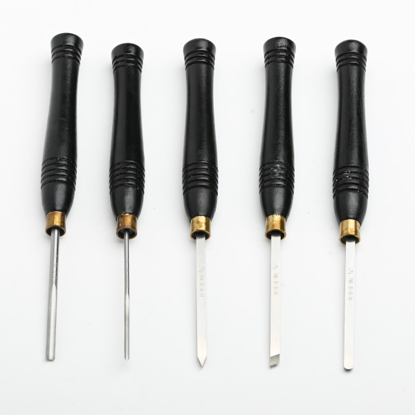 Five-piece mini chisel set in premium long-lasting high speed steel. Benjamin's Best by Penn State Industries. Set includes 1/4" roughing gouge, 1/8" spindle gouge, 1/4" roundnose scraper, 3/32" parting tool, 1/4" skew chisel all with hardwood handles. Wood display box included.