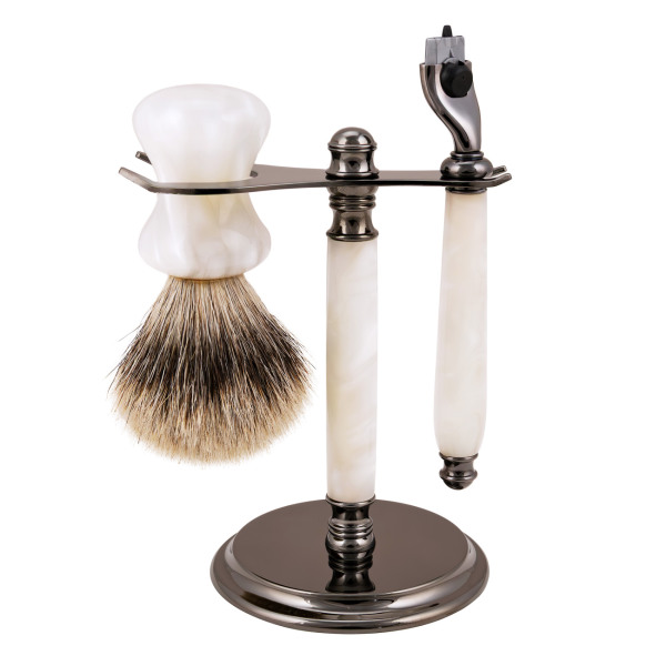 Mach 3 style razor, brush and stand bundle. Includes Deluxe razor and brush stand kit, Mach 3 razor handle and Badger hair shaving knot. Stand requires bushing 94A, mandrel A/7 mm and 7 mm drill (not included). Razor requires bushing PKRAHANBU, mandrel A/7 mm and 7 mm drill (not included). Brush requires 20 mm forstner bit, bottle stopper mandrel 3/8-16 and drill and tap set 3/8-16 (not included).